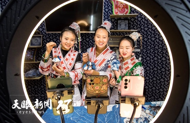 杨文丽网络直播销售苗绣产品。 史开心 摄(贵州图片库发)
